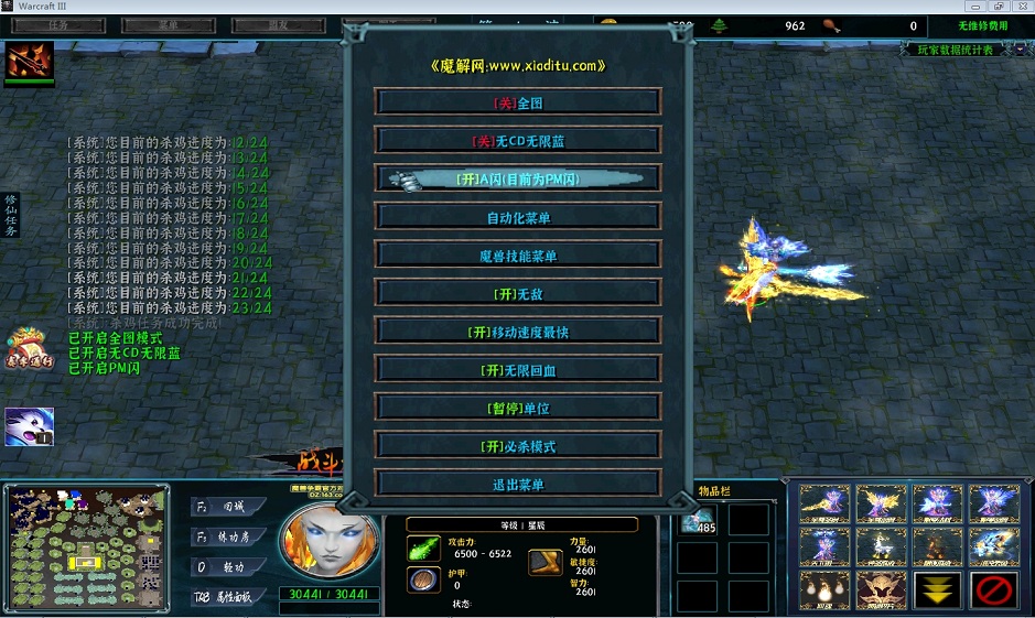| 技能菜单【光环类技能】 | 自动化菜单【自动加钱木,提升英雄三围】 |