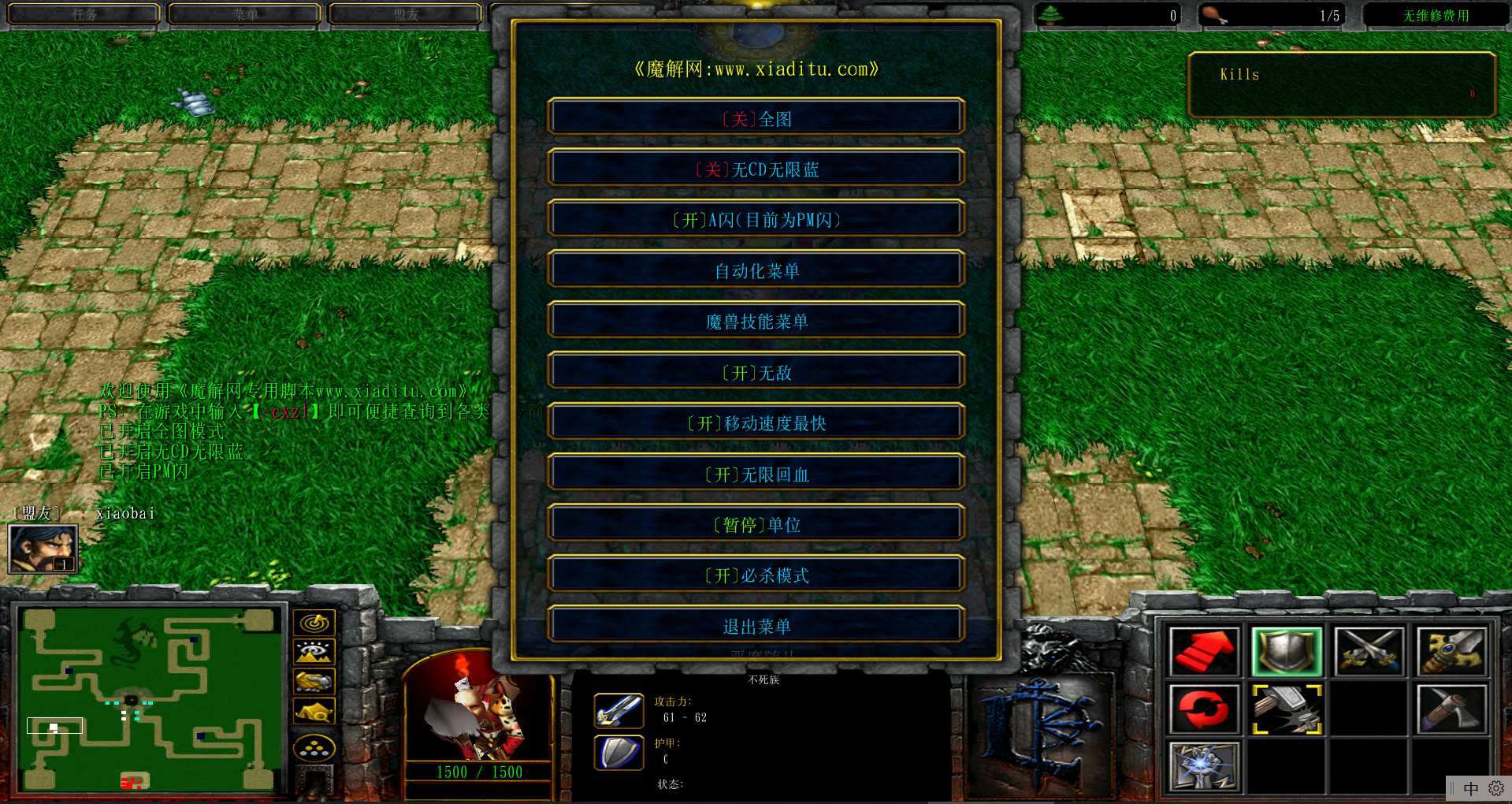 | 技能菜单【光环类技能】 | 自动化菜单【自动加钱木,提升英雄三围】 |
