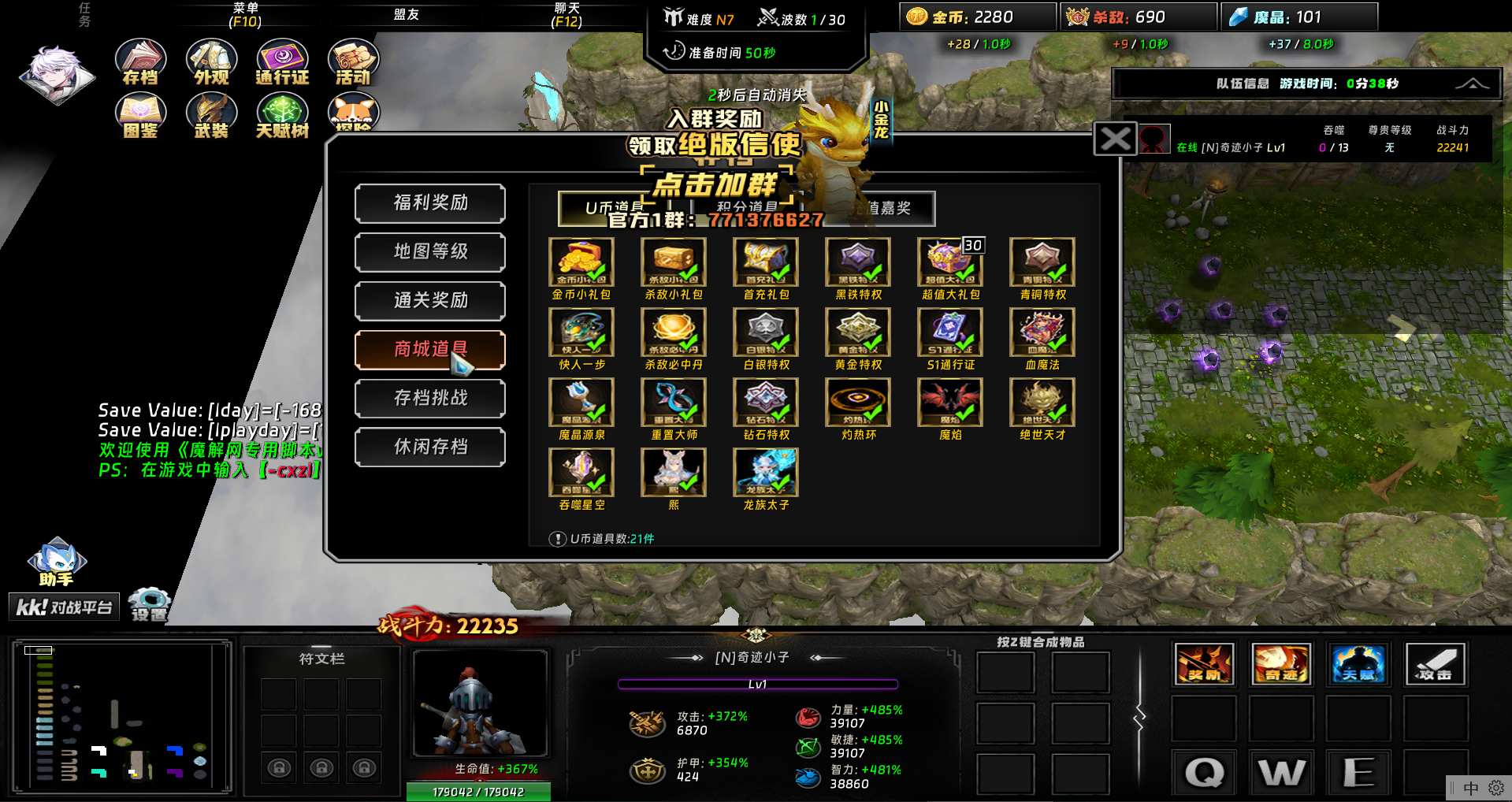 | 技能菜单【光环类技能】 | 自动化菜单【自动加钱木,提升英雄三围】 |