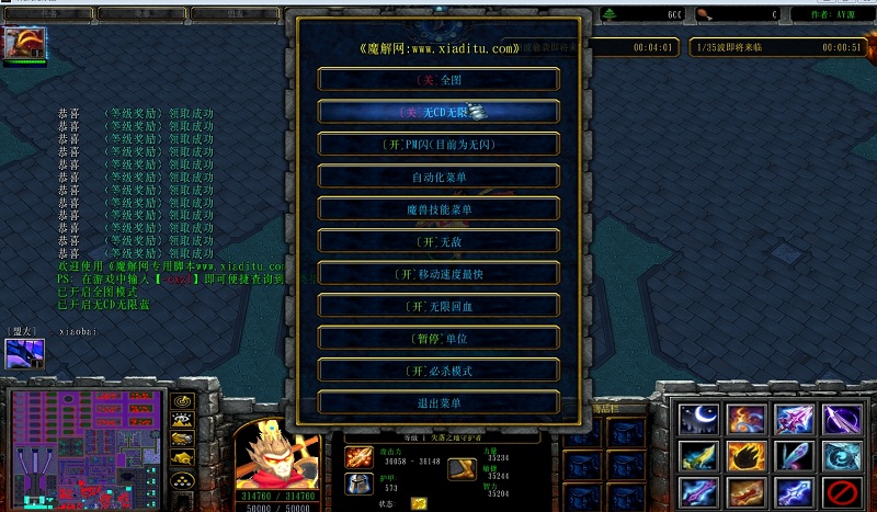 | 技能菜单【光环类技能】 | 自动化菜单【自动加钱木,提升英雄三围】 |
