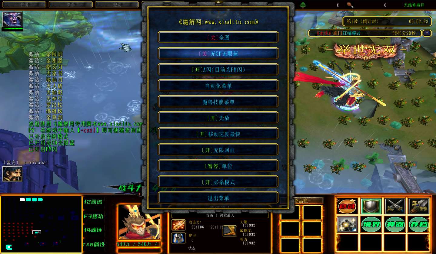 | 技能菜单【光环类技能】 | 自动化菜单【自动加钱木,提升英雄三围】 |
