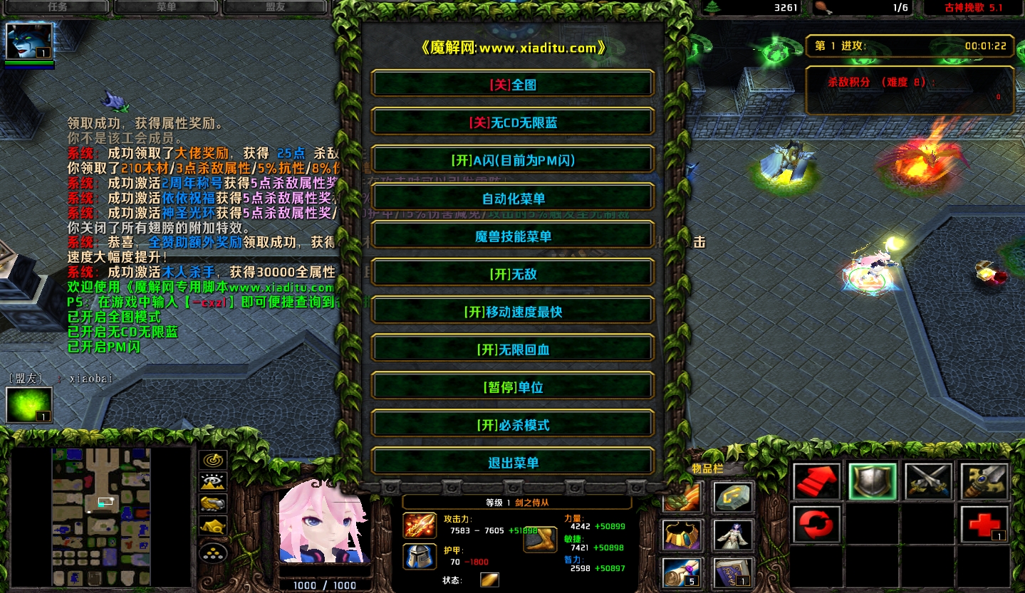 | 技能菜单【光环类技能】 | 自动化菜单【自动加钱木,提升英雄三围】 |