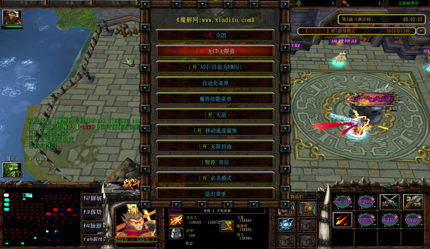 | 技能菜单【光环类技能】 | 自动化菜单【自动加钱木,提升英雄三围】 |