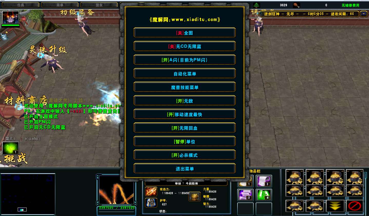 | 技能菜单【光环类技能】 | 自动化菜单【自动加钱木,提升英雄三围】 |