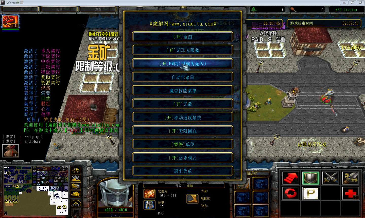 | 技能菜单【光环类技能】 | 自动化菜单【自动加钱木,提升英雄三围】 |