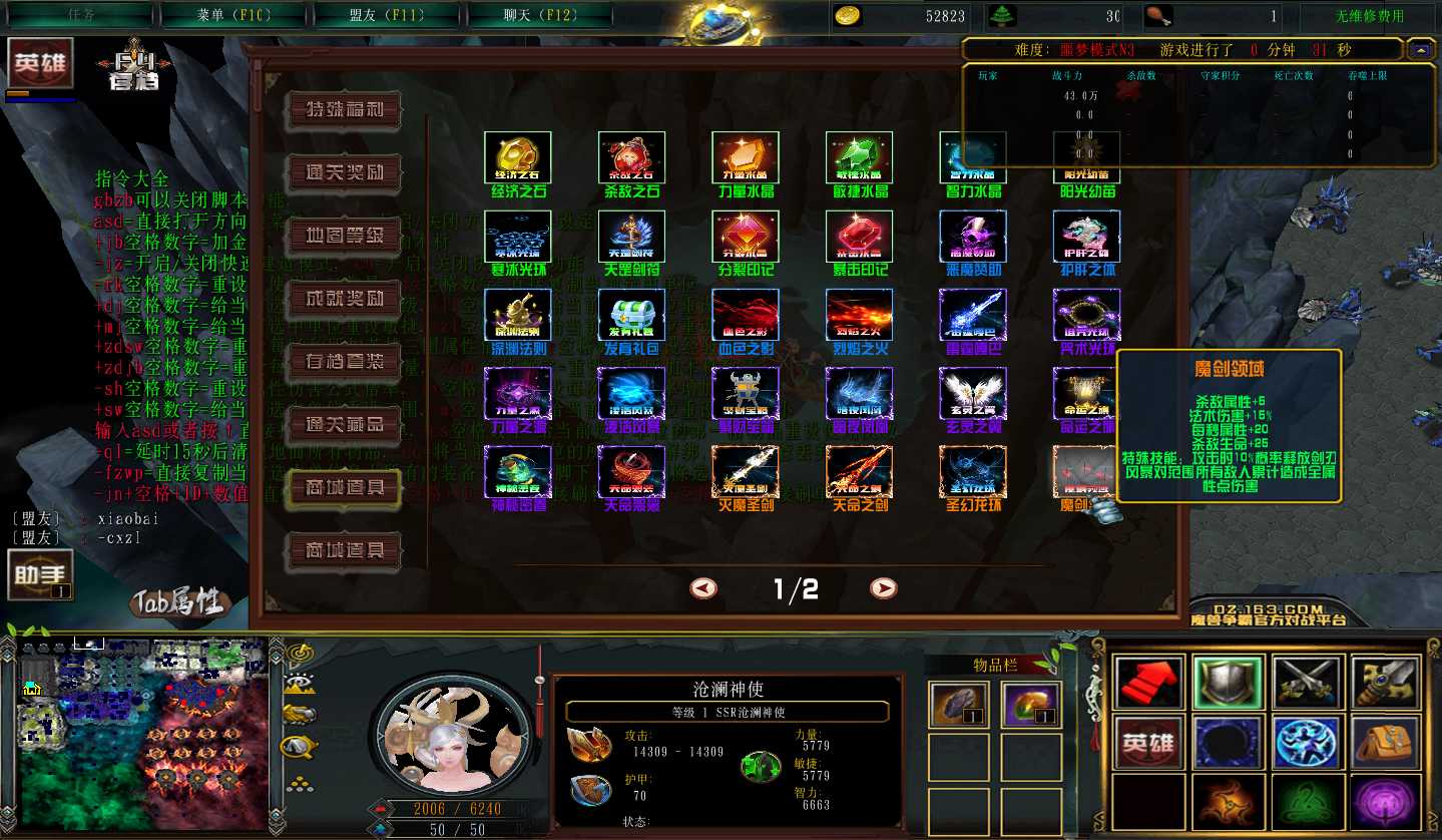 | 技能菜单【光环类技能】 | 自动化菜单【自动加钱木,提升英雄三围】 |