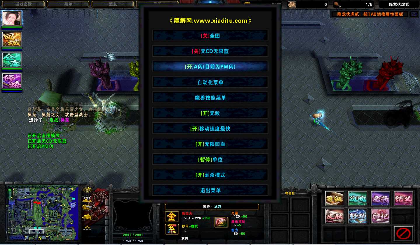 | 技能菜单【光环类技能】 | 自动化菜单【自动加钱木,提升英雄三围】 |