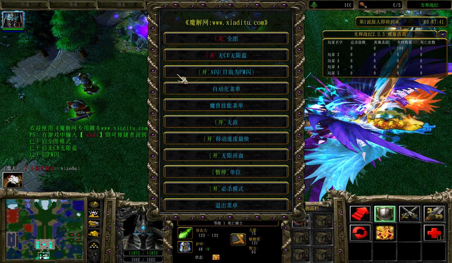 | 技能菜单【光环类技能】 | 自动化菜单【自动加钱木,提升英雄三围】 |