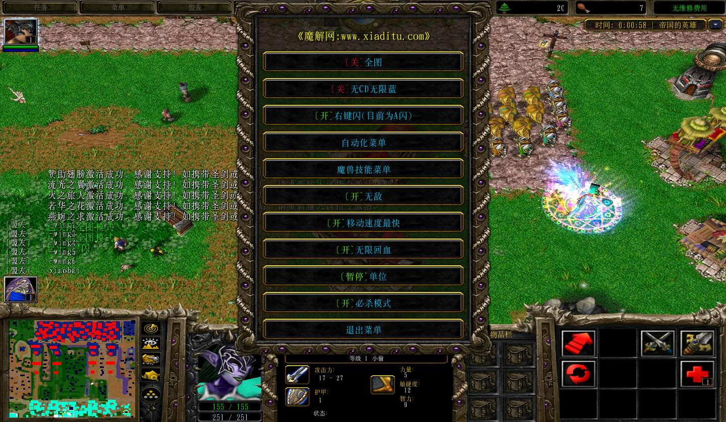 | 技能菜单【光环类技能】 | 自动化菜单【自动加钱木,提升英雄三围】 |