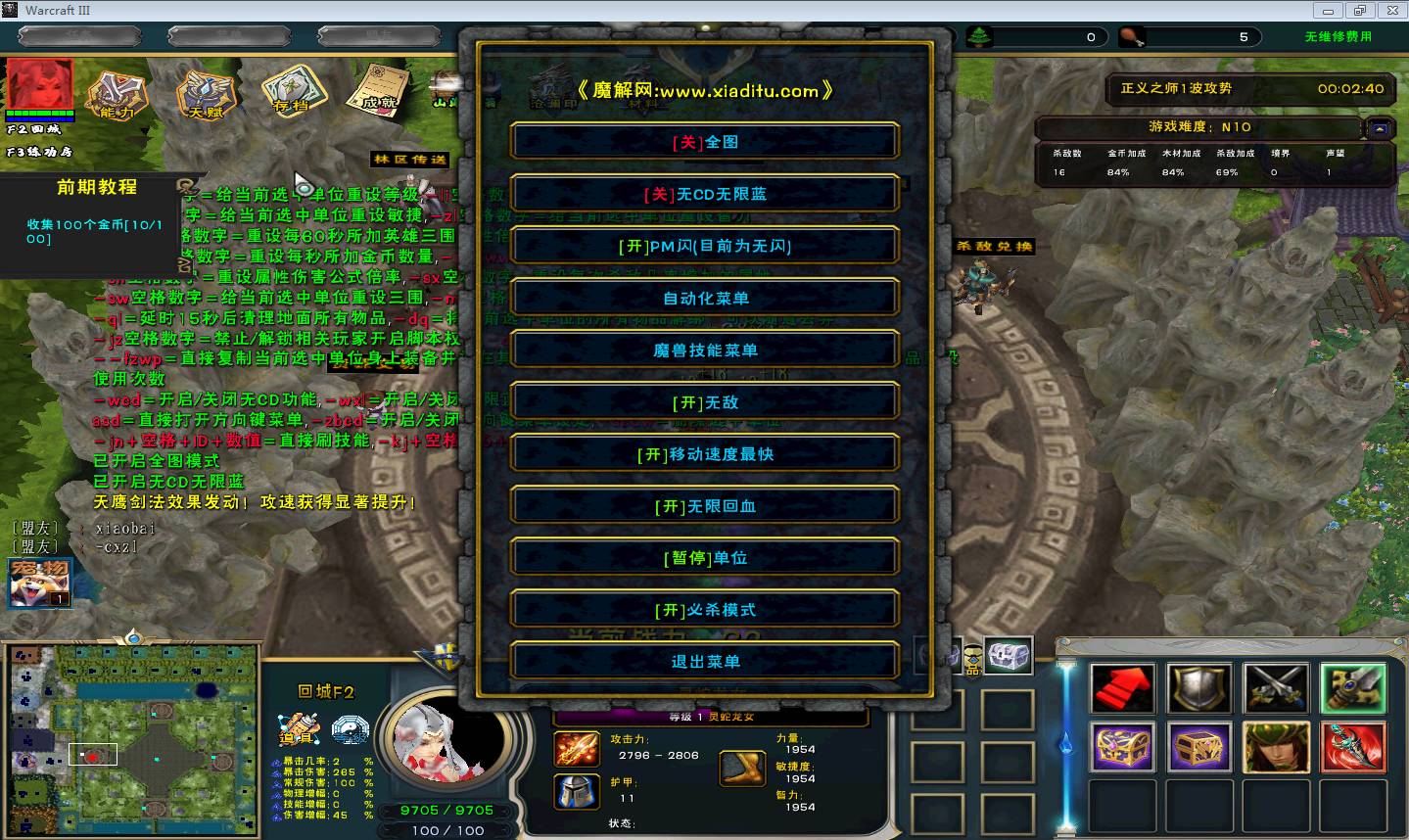 | 技能菜单【光环类技能】 | 自动化菜单【自动加钱木,提升英雄三围】 |