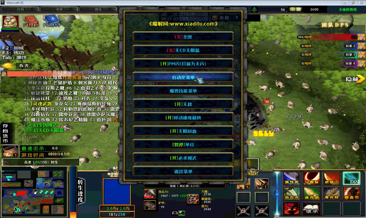 | 技能菜单【光环类技能】 | 自动化菜单【自动加钱木,提升英雄三围】 |