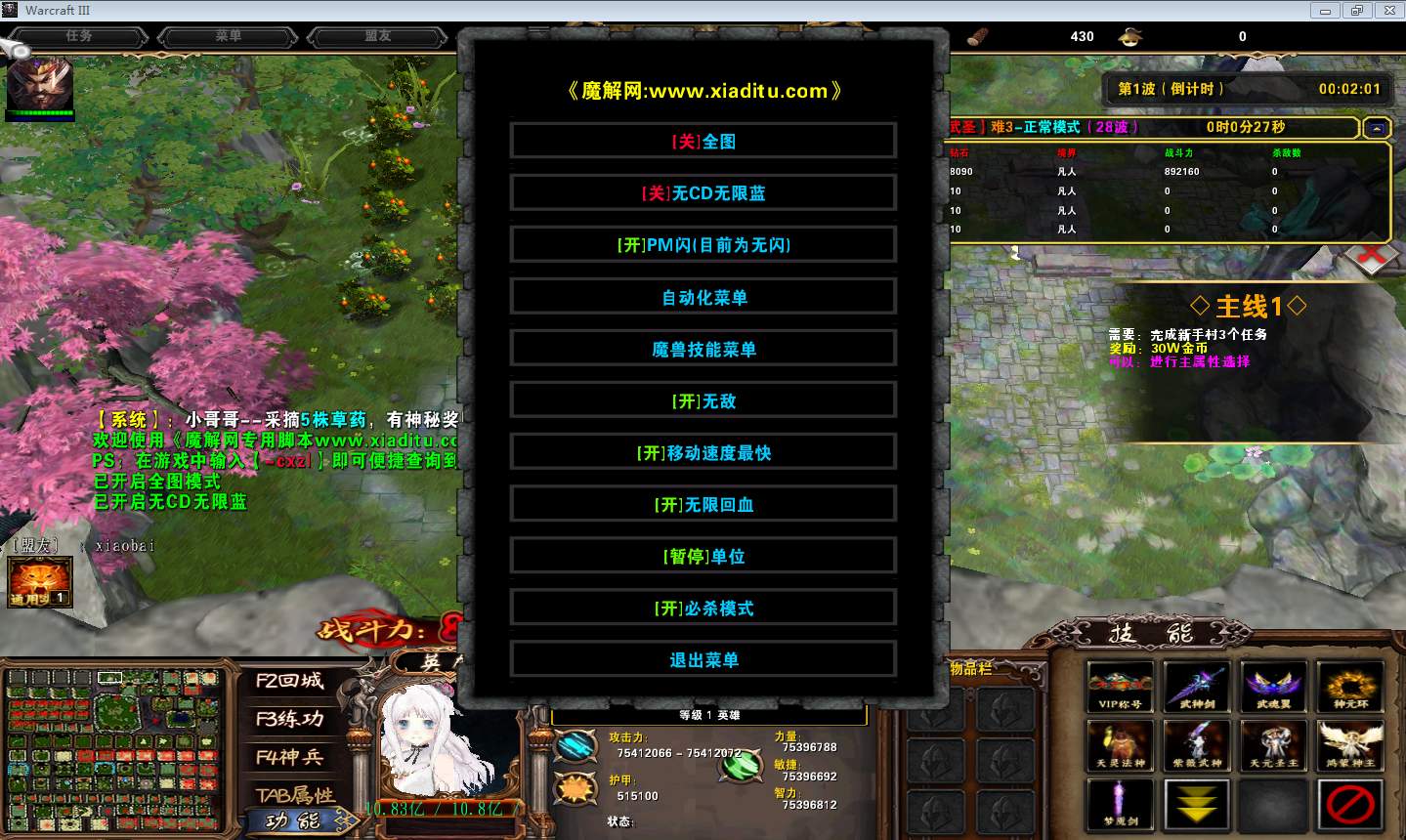 | 技能菜单【光环类技能】 | 自动化菜单【自动加钱木,提升英雄三围】 |