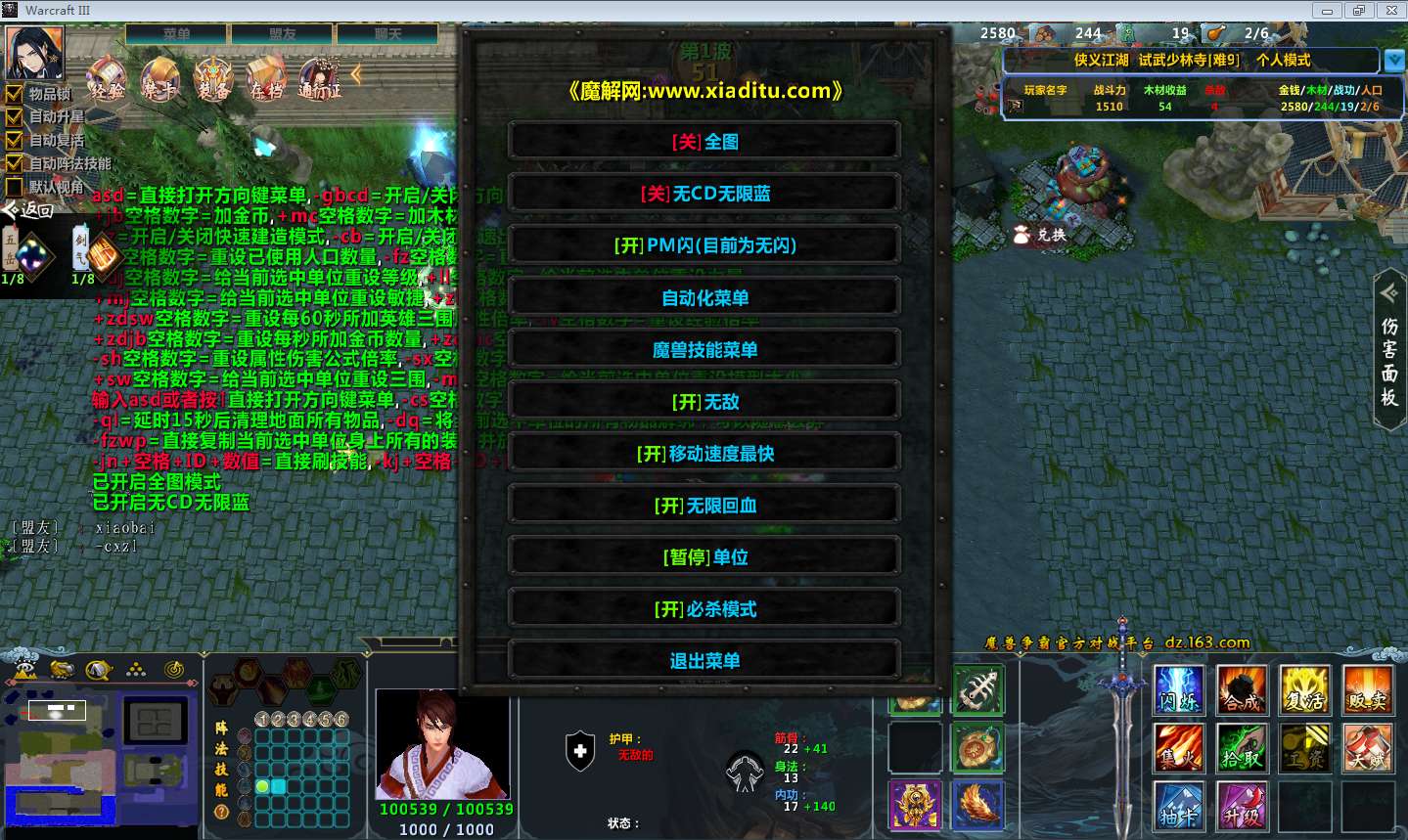 | 技能菜单【光环类技能】 | 自动化菜单【自动加钱木,提升英雄三围】 |