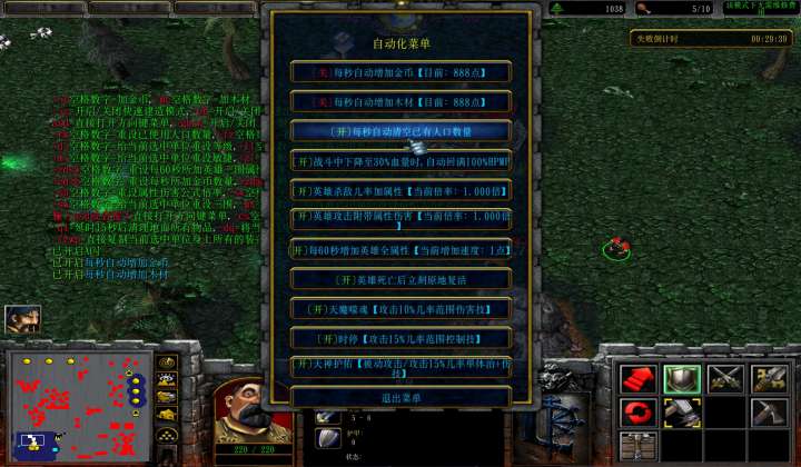 | 技能菜单【光环类技能】 | 自动化菜单【自动加钱木,提升英雄三围】 |