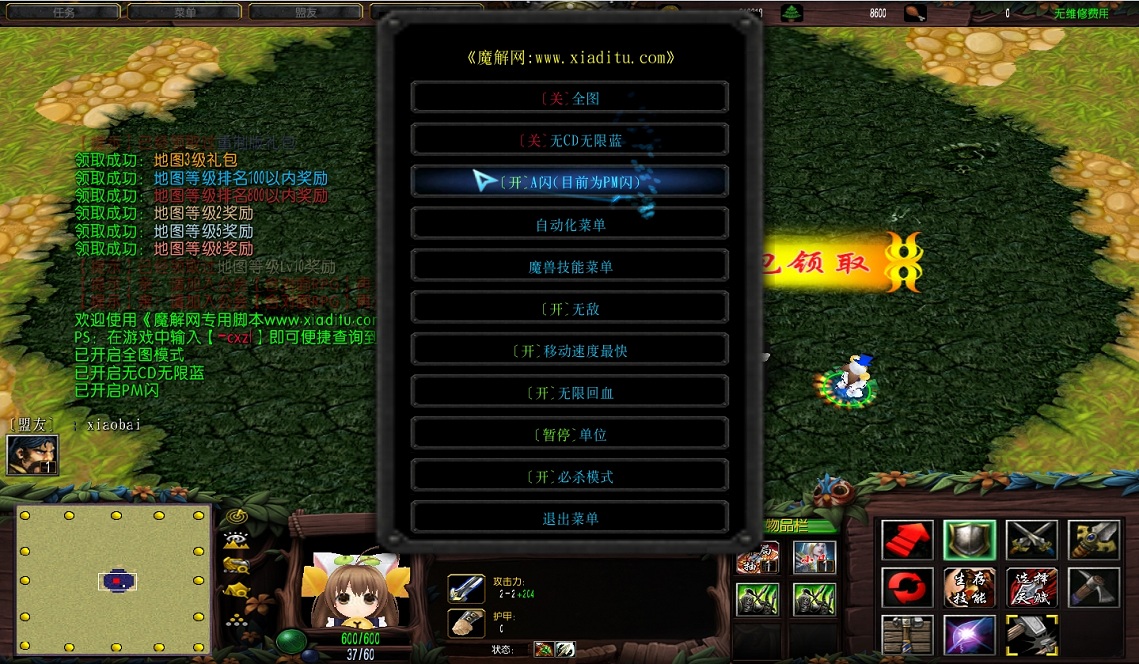 | 技能菜单【光环类技能】 | 自动化菜单【自动加钱木,提升英雄三围】 |