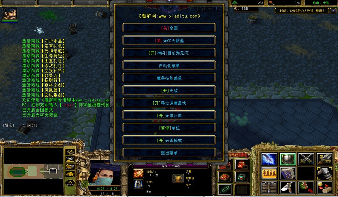 | 技能菜单【光环类技能】 | 自动化菜单【自动加钱木,提升英雄三围】 |