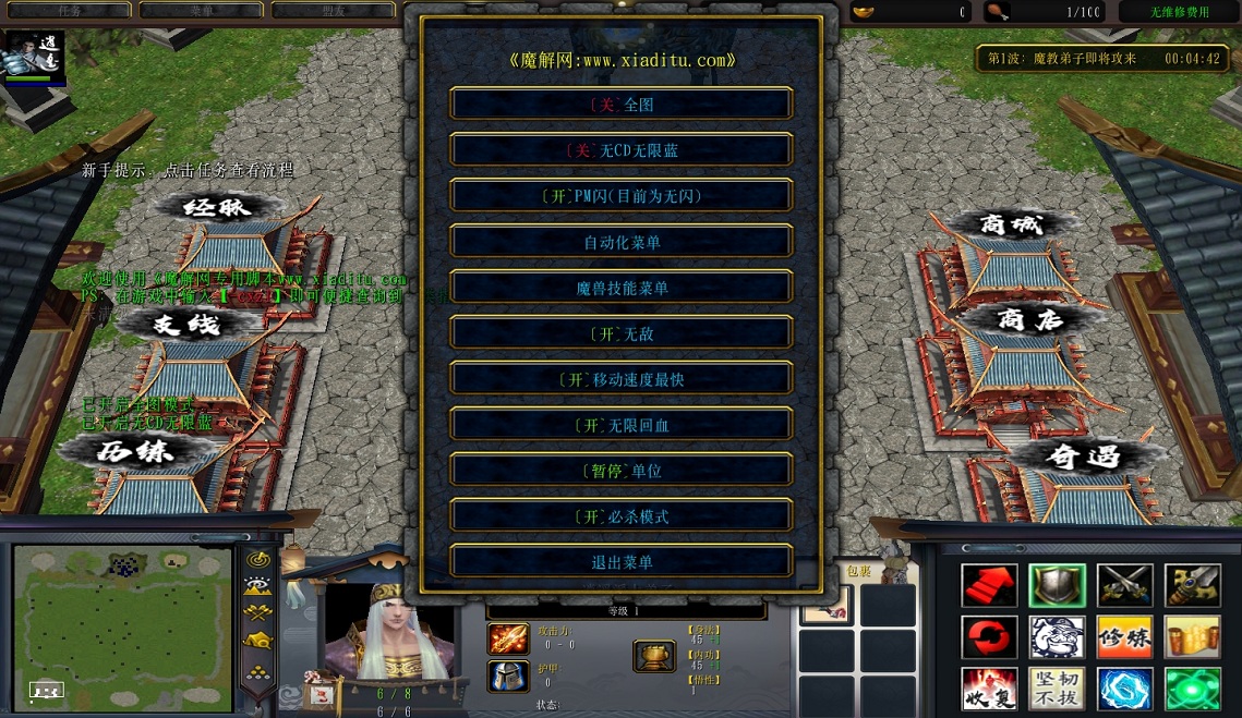 | 技能菜单【光环类技能】 | 自动化菜单【自动加钱木,提升英雄三围】 |