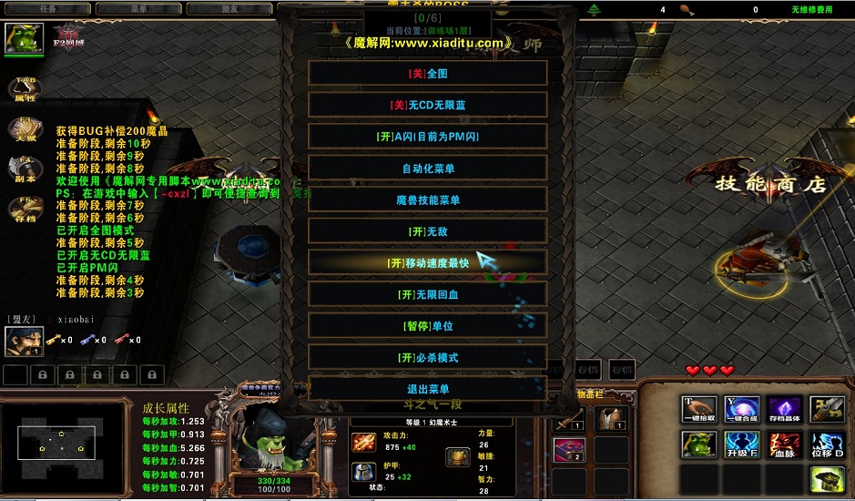 | 技能菜单【光环类技能】 | 自动化菜单【自动加钱木,提升英雄三围】 |