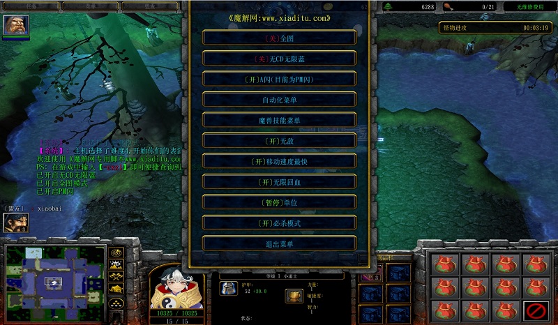 | 技能菜单【光环类技能】 | 自动化菜单【自动加钱木,提升英雄三围】 |