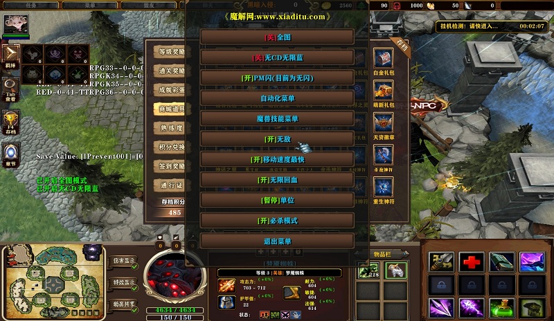 | 技能菜单【光环类技能】 | 自动化菜单【自动加钱木,提升英雄三围】 |
