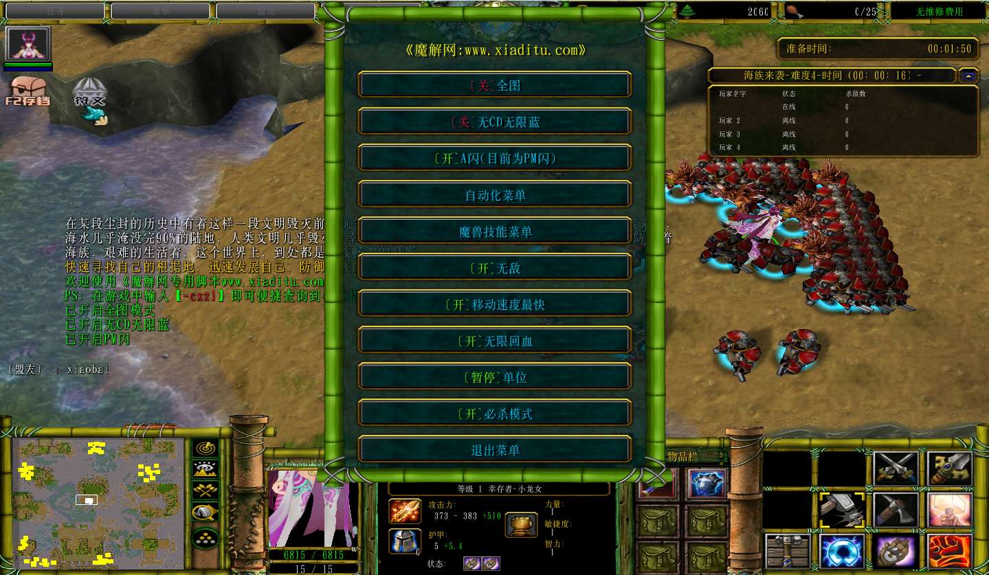 | 技能菜单【光环类技能】 | 自动化菜单【自动加钱木,提升英雄三围】 |