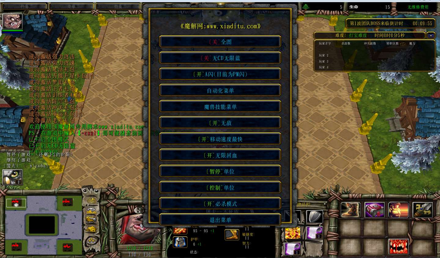 | 技能菜单【光环类技能】 | 自动化菜单【自动加钱木,提升英雄三围】 |