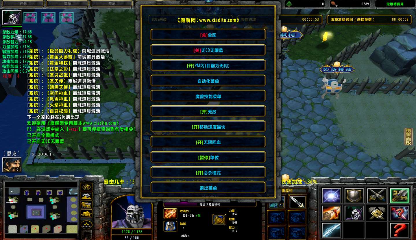 | 技能菜单【光环类技能】 | 自动化菜单【自动加钱木,提升英雄三围】 |