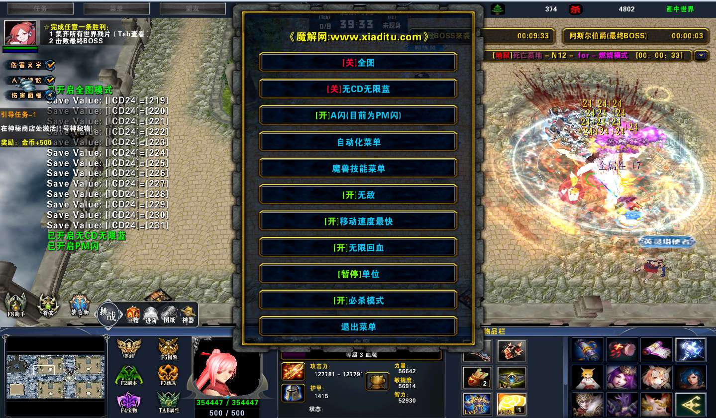 | 技能菜单【光环类技能】 | 自动化菜单【自动加钱木,提升英雄三围】 |