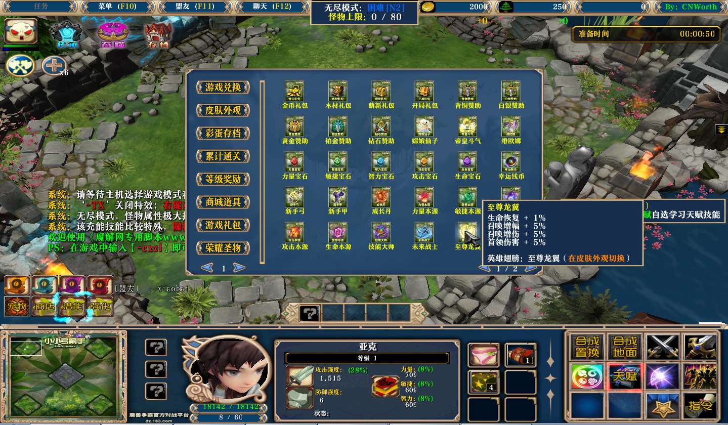 | 技能菜单【光环类技能】 | 自动化菜单【自动加钱木,提升英雄三围】 |