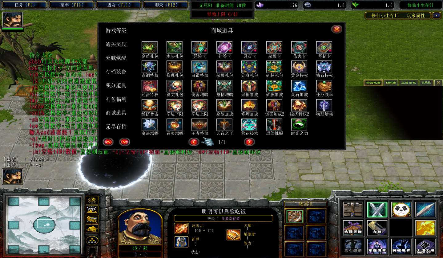 | 技能菜单【光环类技能】 | 自动化菜单【自动加钱木,提升英雄三围】 |