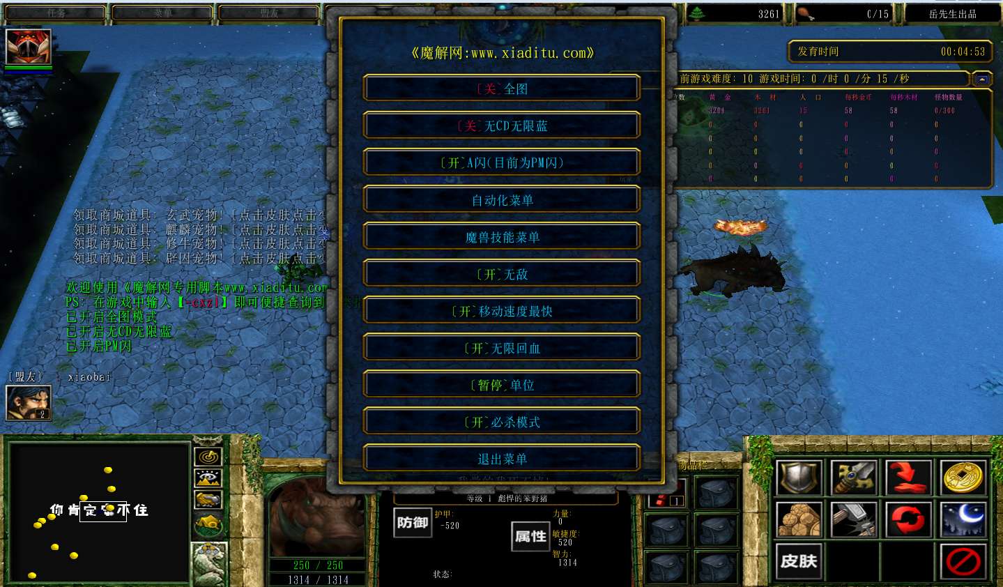 | 技能菜单【光环类技能】 | 自动化菜单【自动加钱木,提升英雄三围】 |