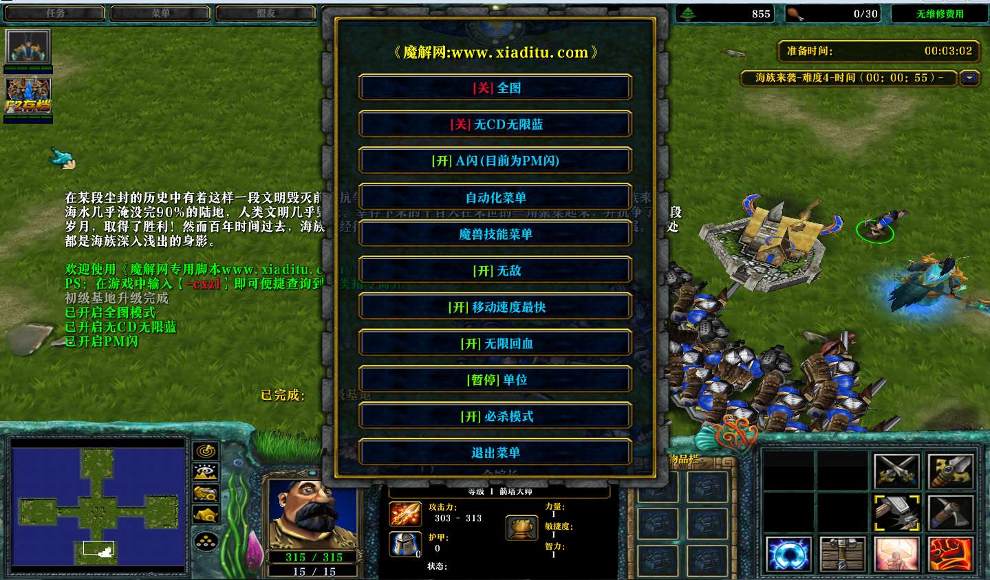 | 技能菜单【光环类技能】 | 自动化菜单【自动加钱木,提升英雄三围】 |