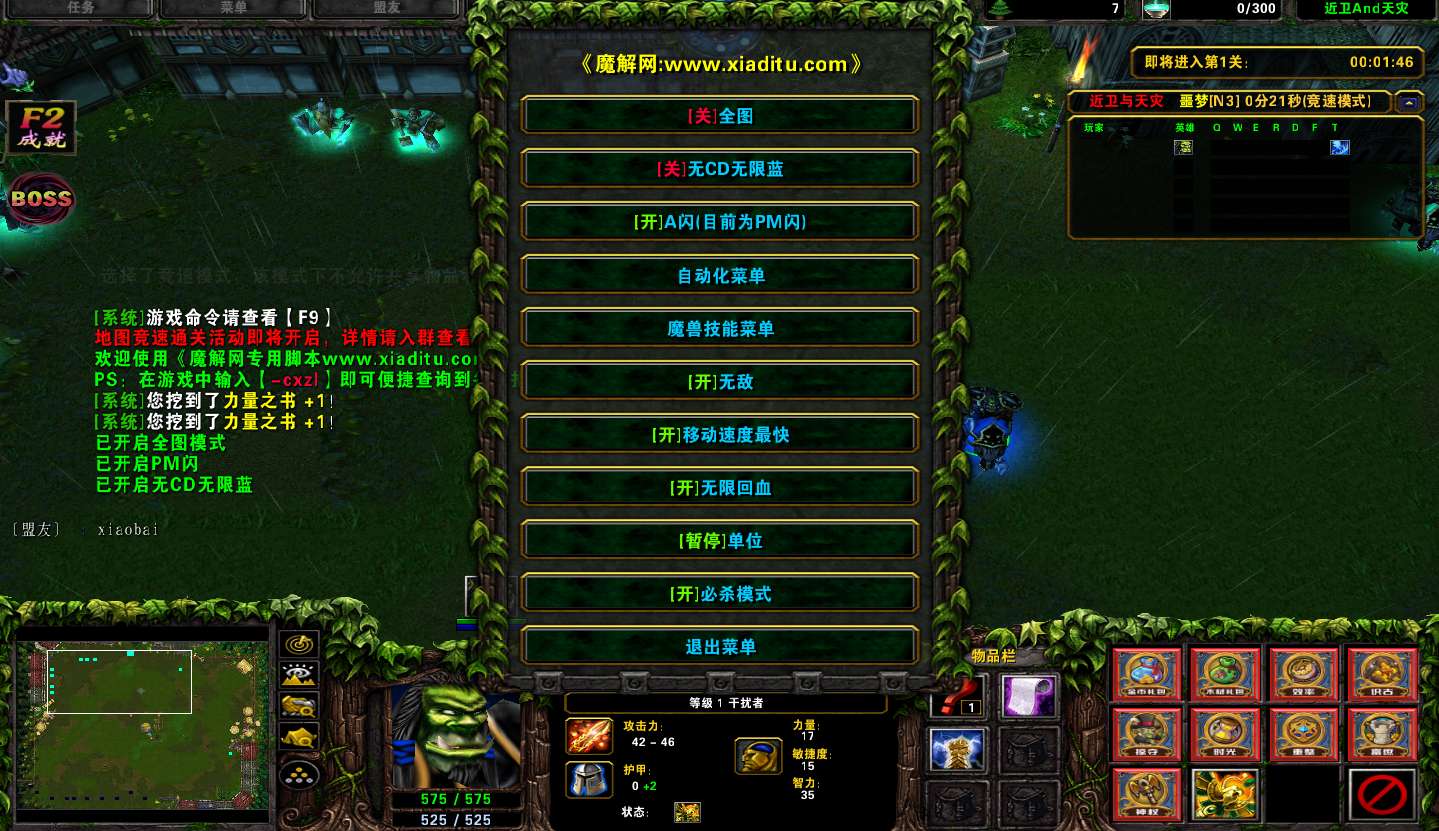 | 技能菜单【光环类技能】 | 自动化菜单【自动加钱木,提升英雄三围】 |