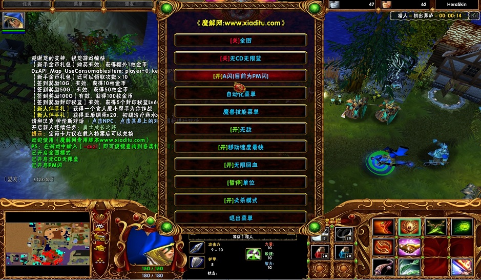 | 技能菜单【光环类技能】 | 自动化菜单【自动加钱木,提升英雄三围】 |