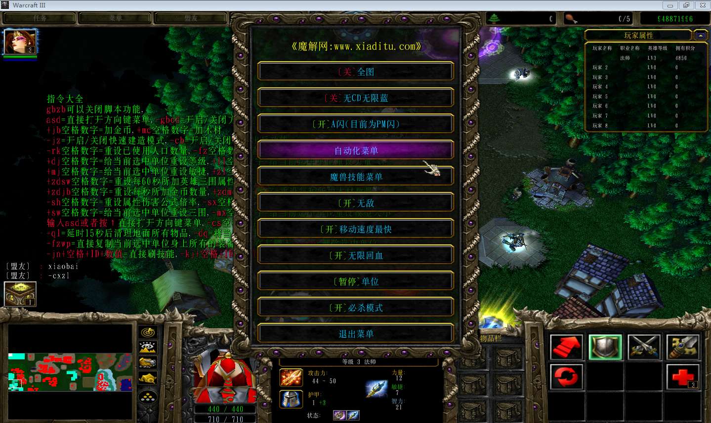 | 技能菜单【光环类技能】 | 自动化菜单【自动加钱木,提升英雄三围】 |
