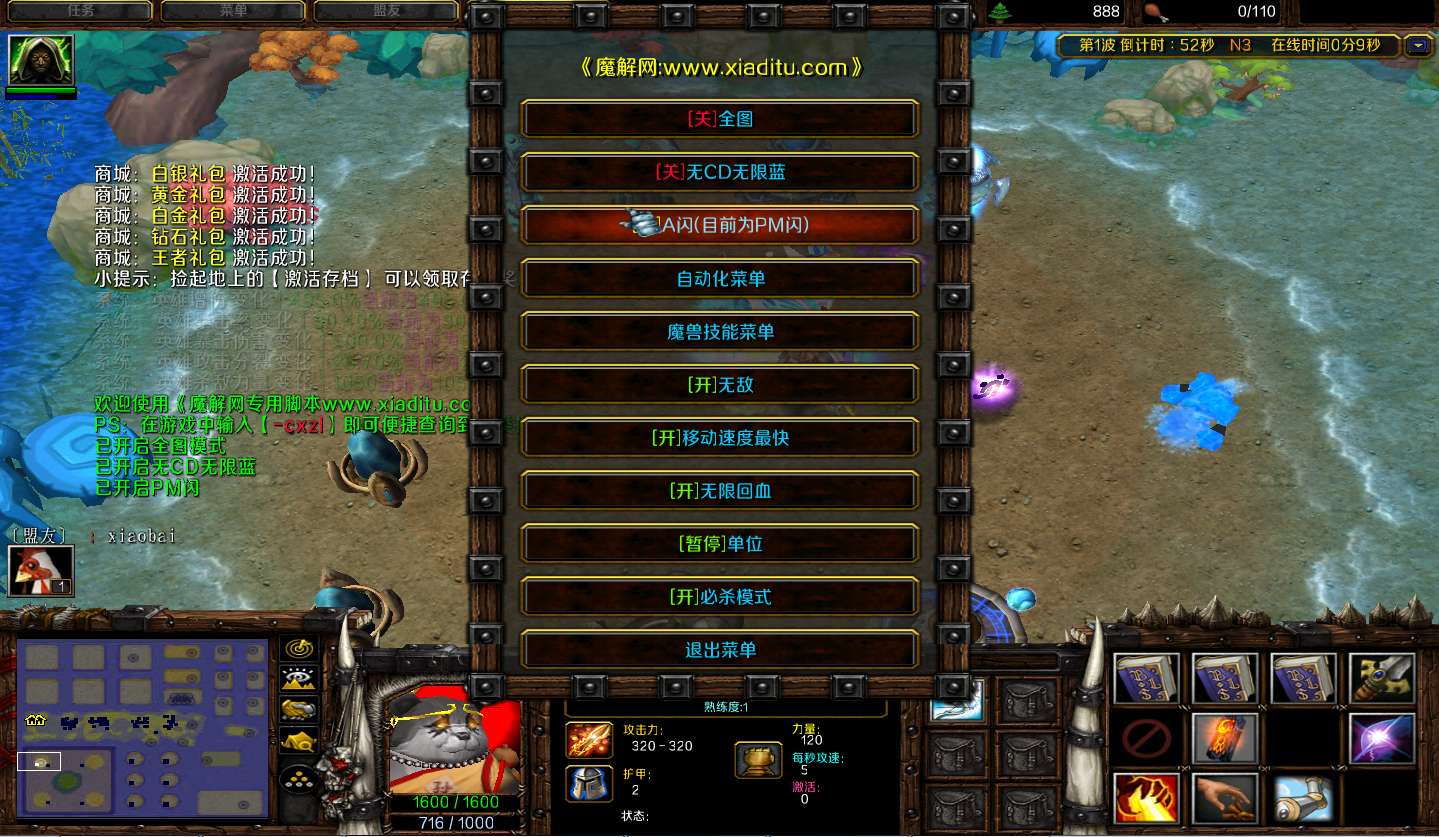| 技能菜单【光环类技能】 | 自动化菜单【自动加钱木,提升英雄三围】 |