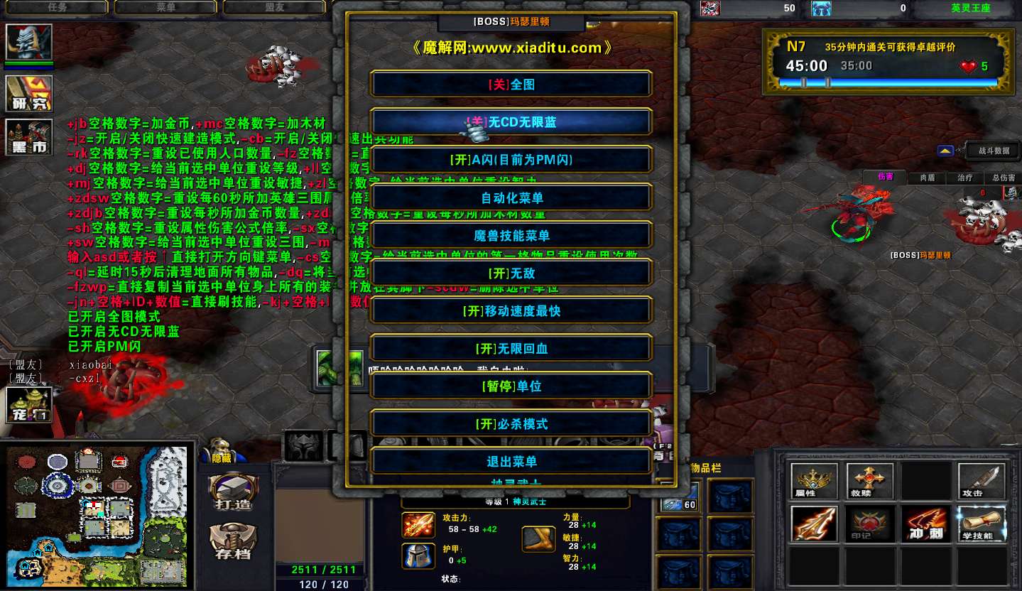 | 技能菜单【光环类技能】 | 自动化菜单【自动加钱木,提升英雄三围】 |
