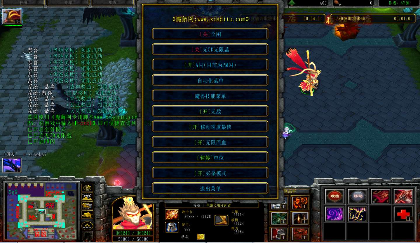 | 技能菜单【光环类技能】 | 自动化菜单【自动加钱木,提升英雄三围】 |