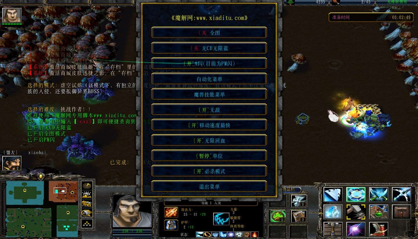 | 技能菜单【光环类技能】 | 自动化菜单【自动加钱木,提升英雄三围】 |