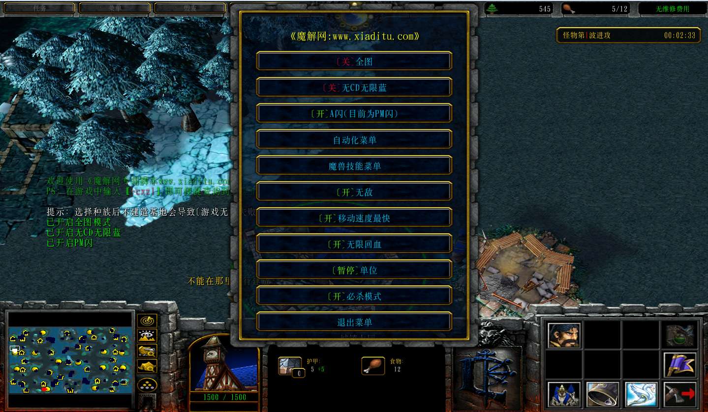 | 技能菜单【光环类技能】 | 自动化菜单【自动加钱木,提升英雄三围】 |