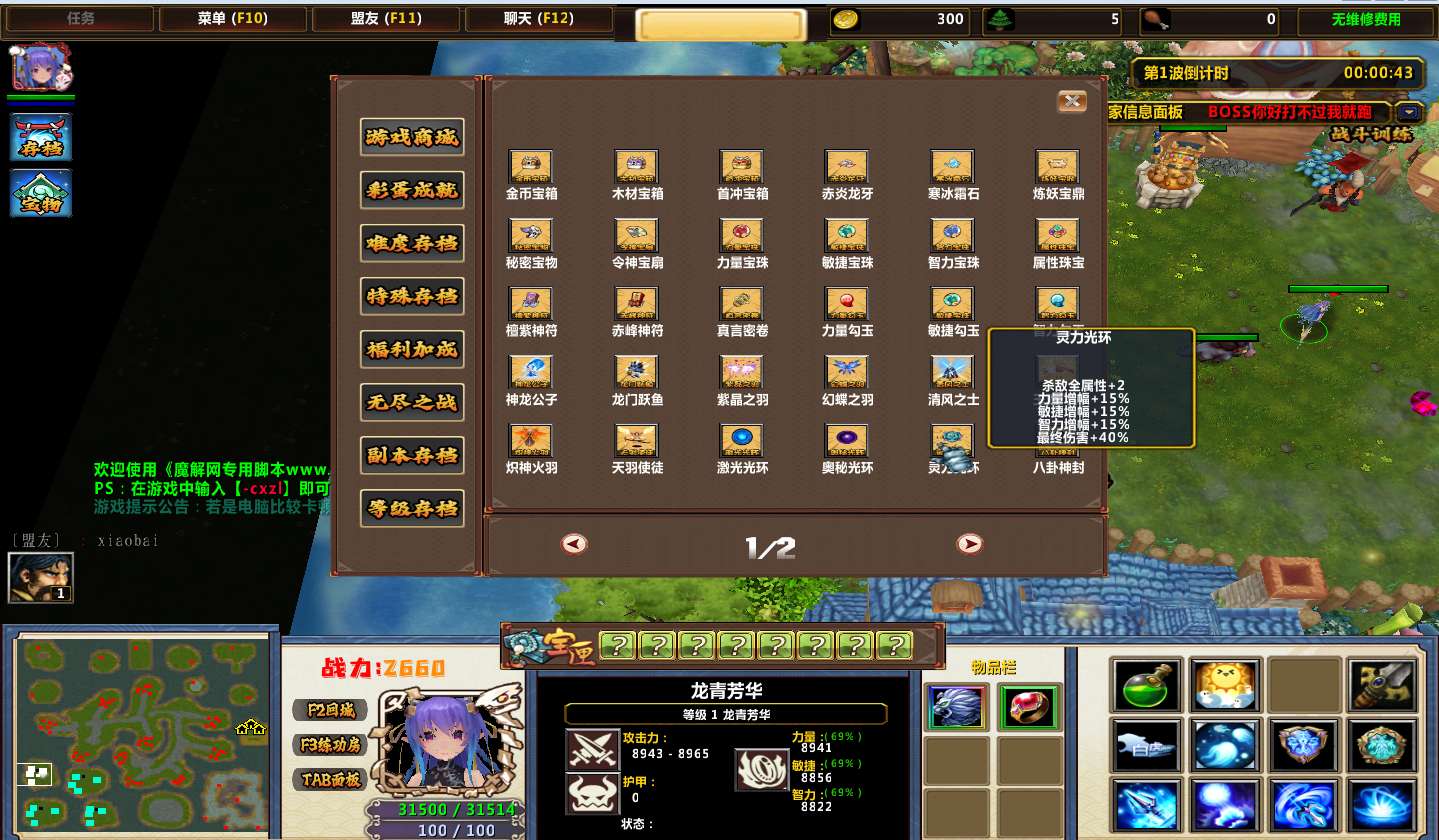 | 技能菜单【光环类技能】 | 自动化菜单【自动加钱木,提升英雄三围】 |