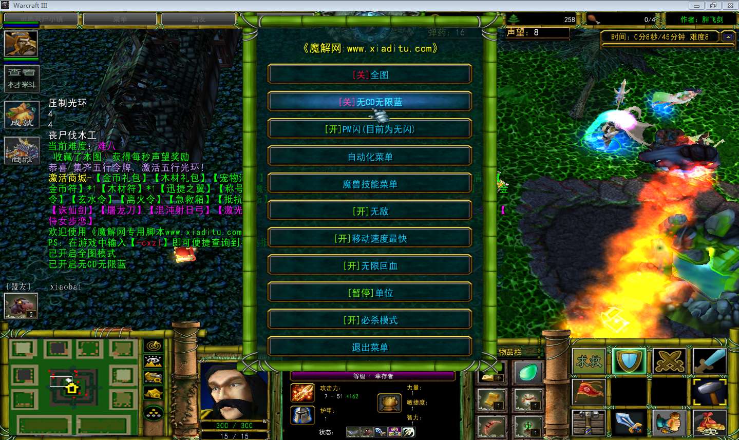 | 技能菜单【光环类技能】 | 自动化菜单【自动加钱木,提升英雄三围】 |