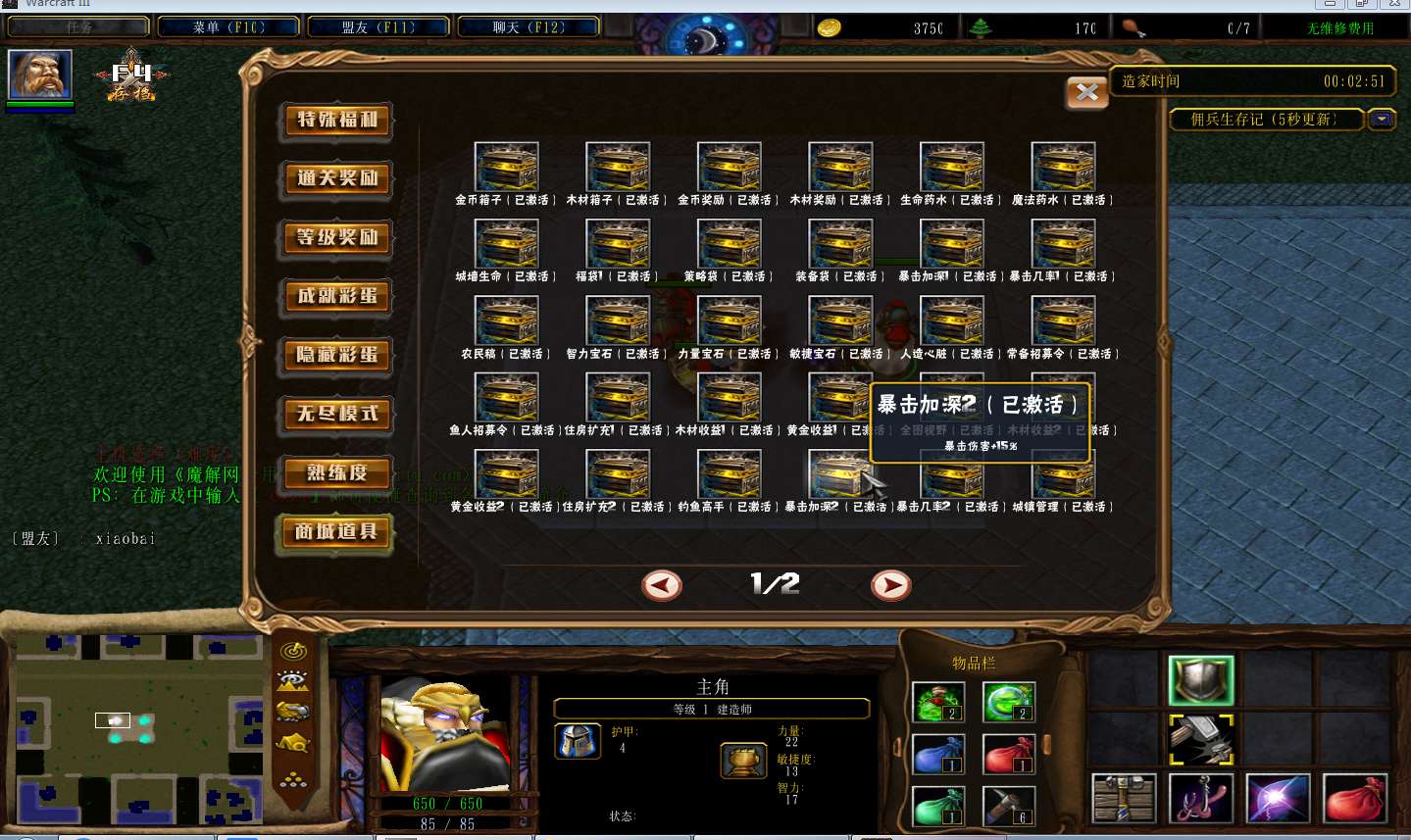 | 技能菜单【光环类技能】 | 自动化菜单【自动加钱木,提升英雄三围】 |