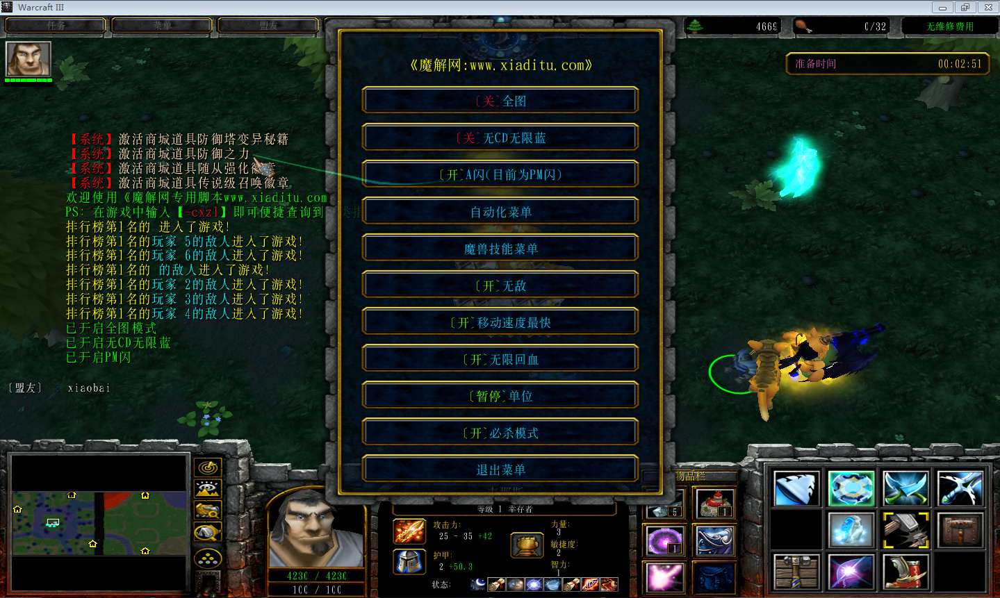 | 技能菜单【光环类技能】 | 自动化菜单【自动加钱木,提升英雄三围】 |