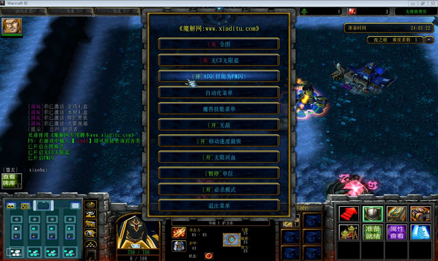 | 技能菜单【光环类技能】 | 自动化菜单【自动加钱木,提升英雄三围】 |