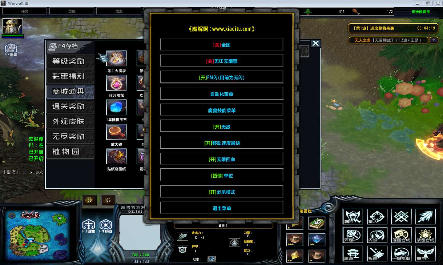 | 技能菜单【光环类技能】 | 自动化菜单【自动加钱木,提升英雄三围】 |
