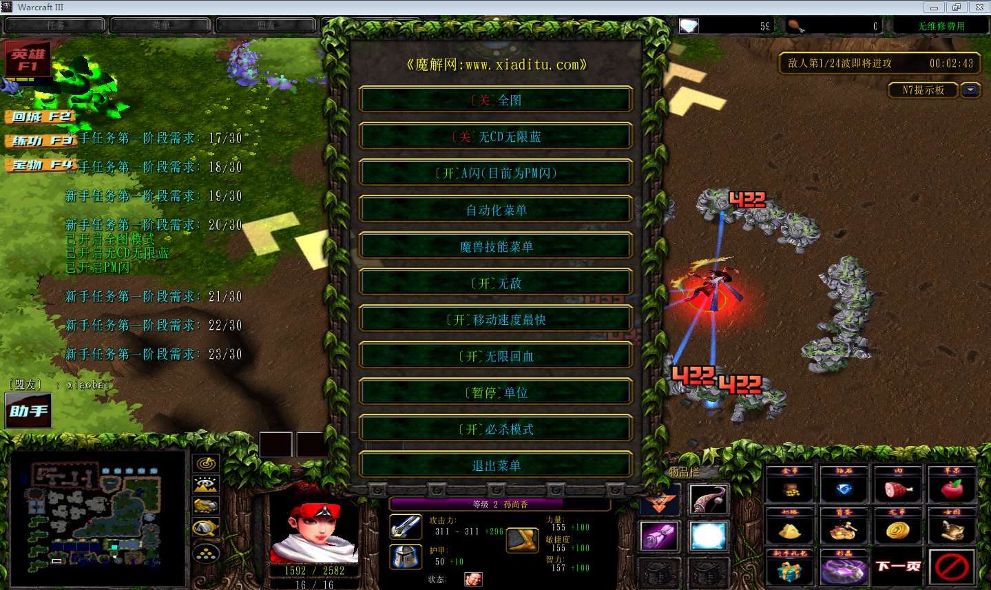 | 技能菜单【光环类技能】 | 自动化菜单【自动加钱木,提升英雄三围】 |