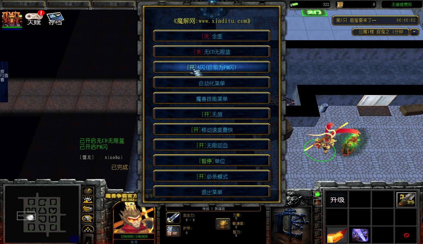 | 技能菜单【光环类技能】 | 自动化菜单【自动加钱木,提升英雄三围】 |