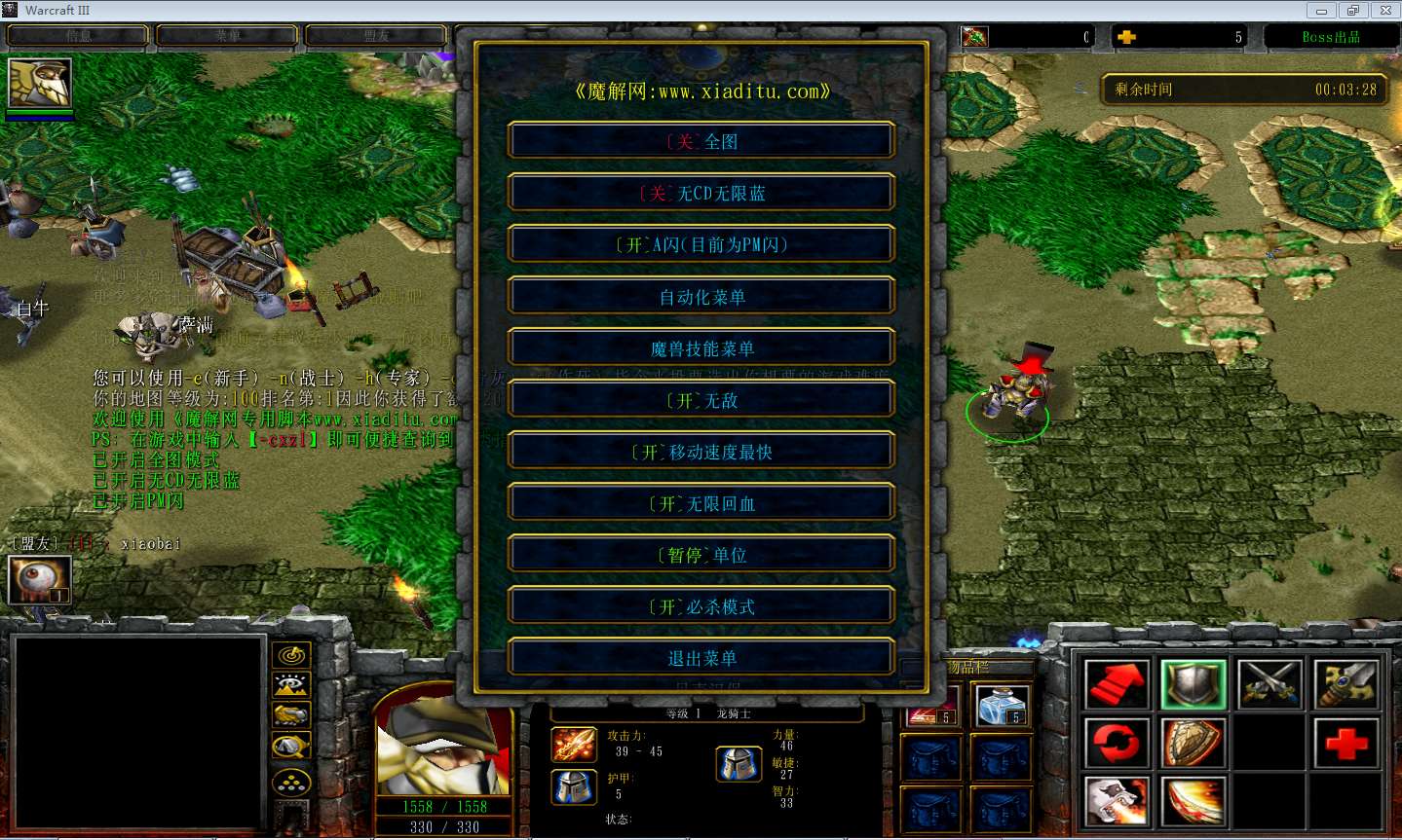 | 技能菜单【光环类技能】 | 自动化菜单【自动加钱木,提升英雄三围】 |