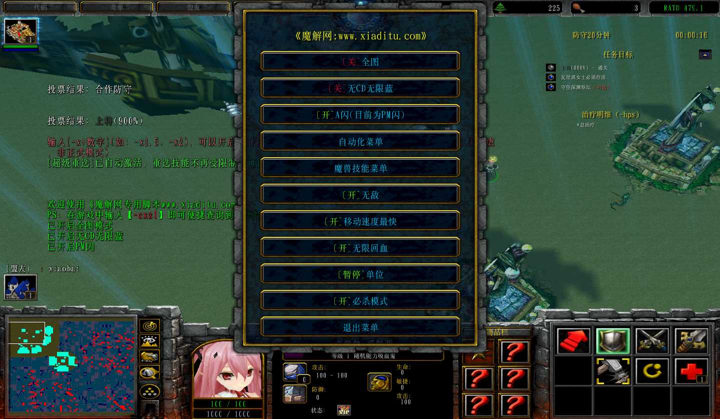 | 技能菜单【光环类技能】 | 自动化菜单【自动加钱木,提升英雄三围】 |